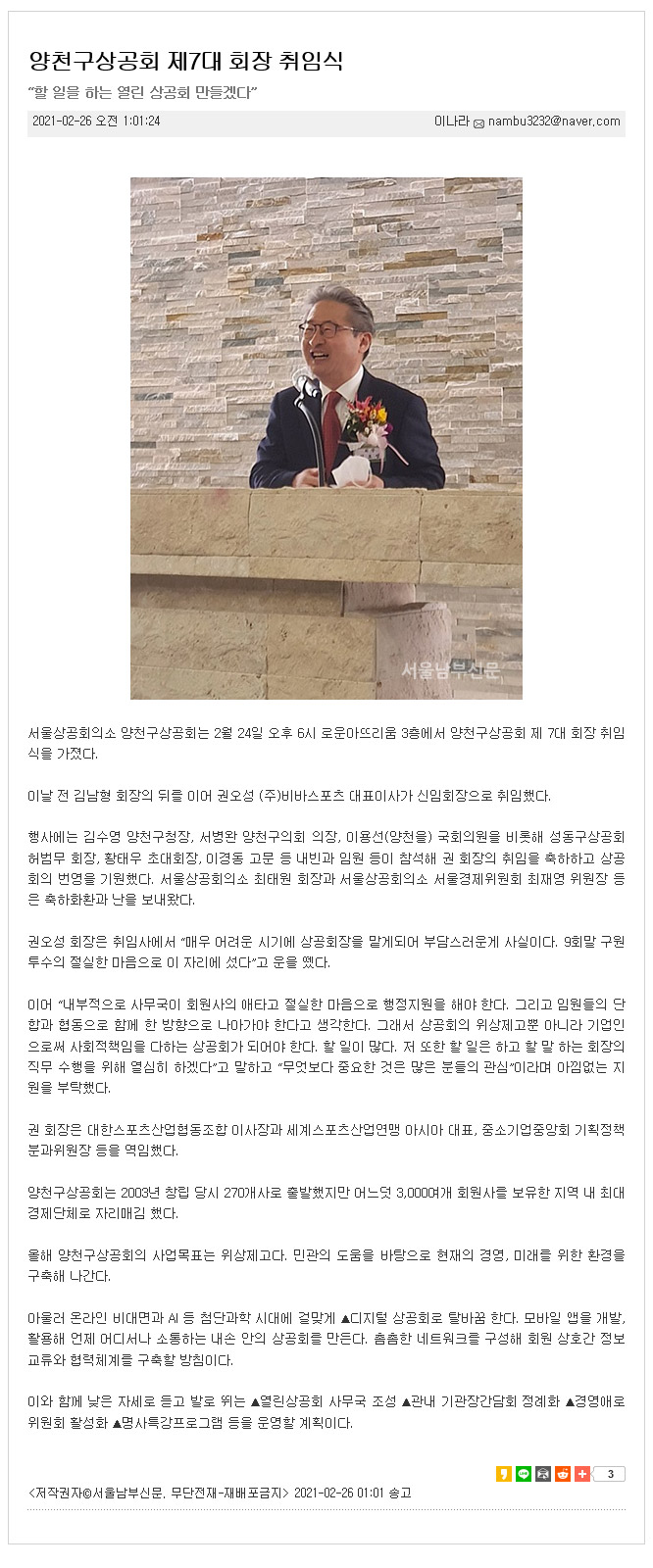 양천구상공회 신임회장에 비바스포츠 권오성 대표 취임