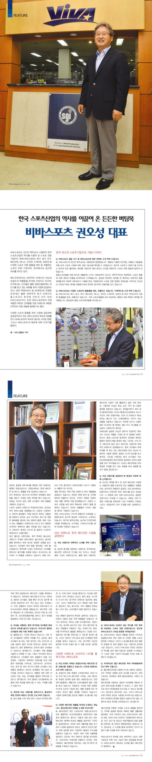 2014년 7월호 월간 배드민턴에 한국 스포츠산업의 역사를 이끌어 온 든든한 버팀목인 비바스포츠 권오성 대표님의 인터뷰가 게재되었습니다.