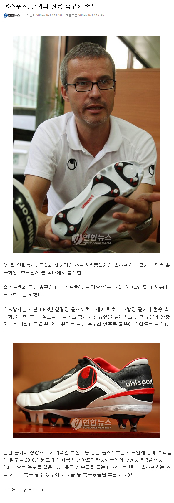 2009년 8월17일 연합뉴스 “울스포츠, 골키퍼 전용 축구화 출시” (2009.08)